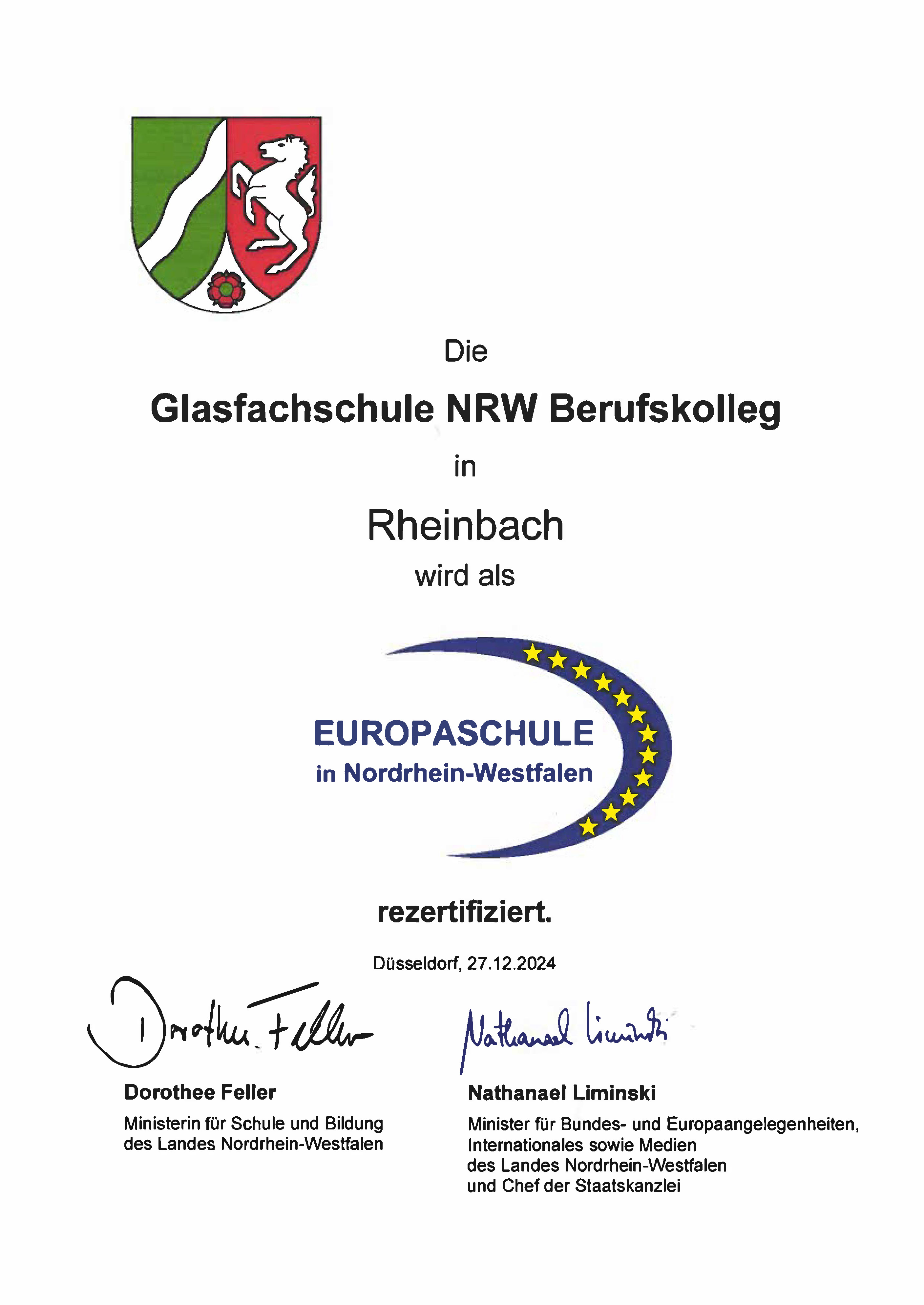Für ein kontinuierlich hochwertiges Engagement in der Europäisierung der Berufsausbildung wurde die Staatliche Glasfachschule Rheinbach, die seit 2014 Europaschule in NRW ist, Ende 2019 und Ende 2024 vom Ministerium für Schule und Bildung erneut als Europaschule bestätigt und damit rezertifiziert.