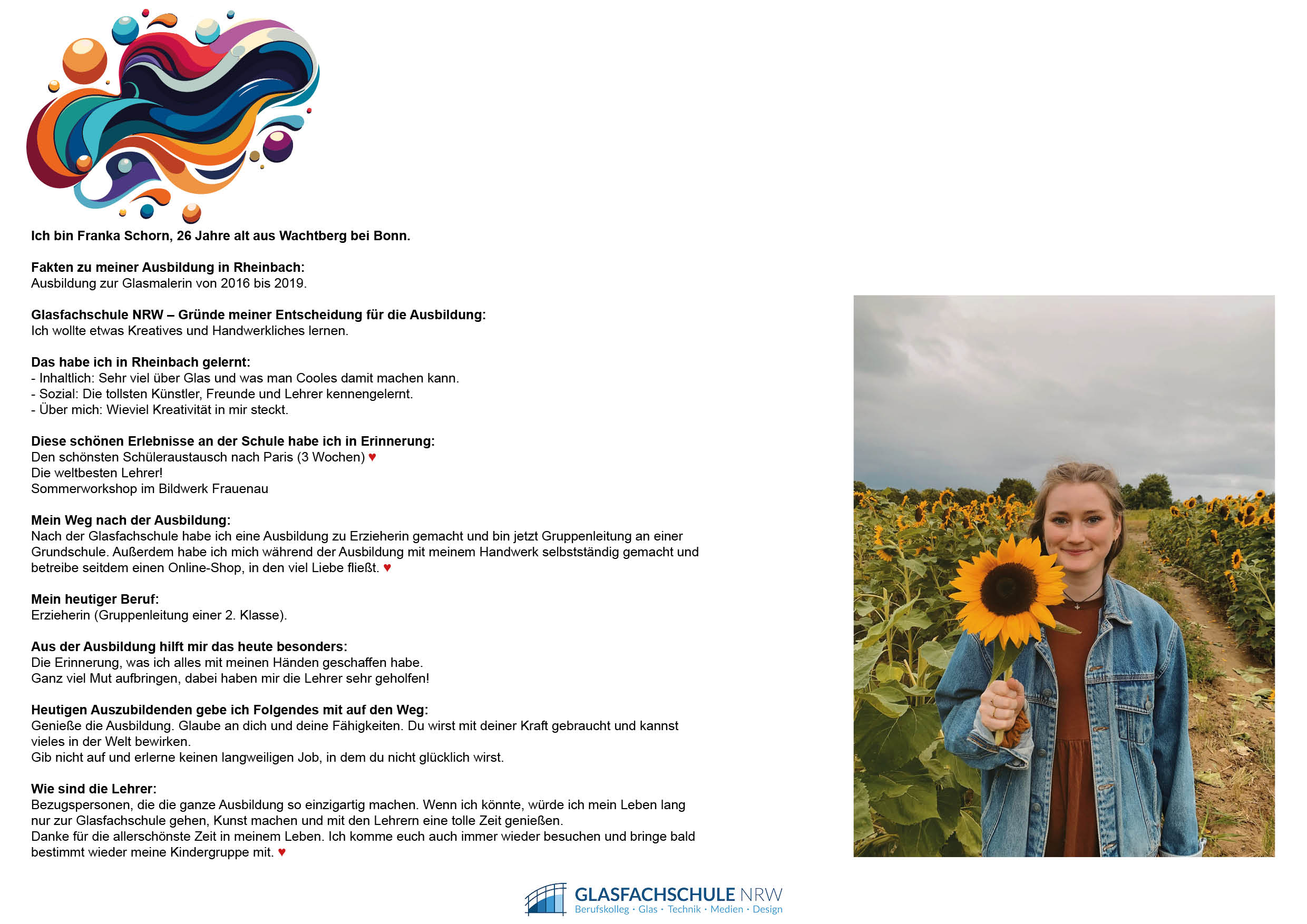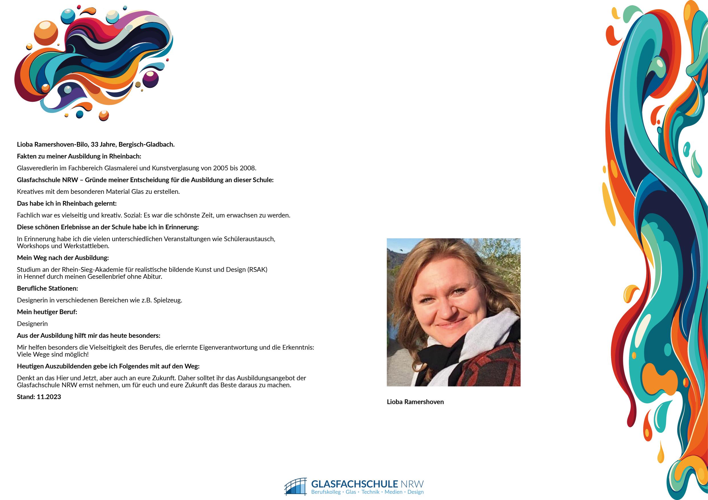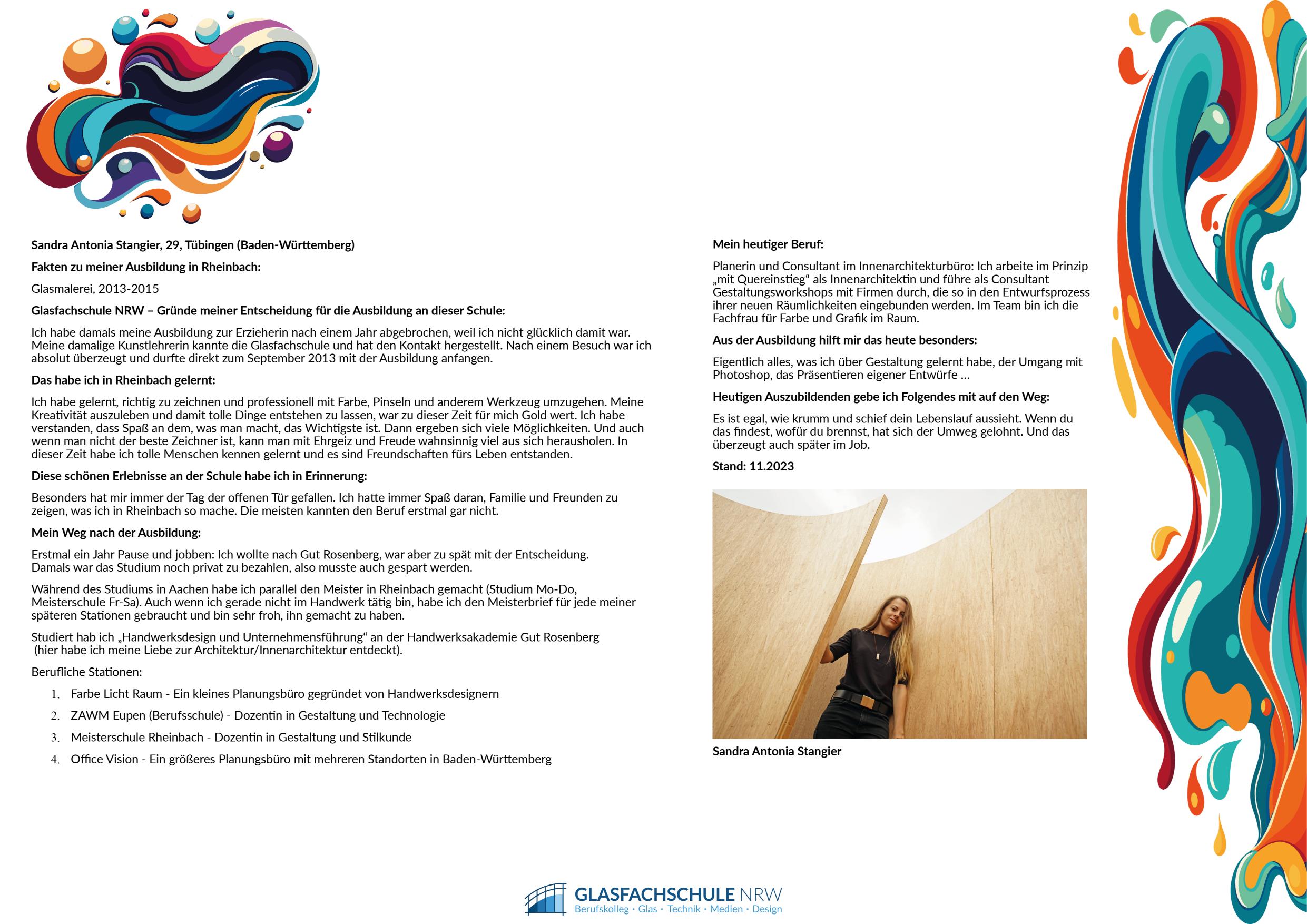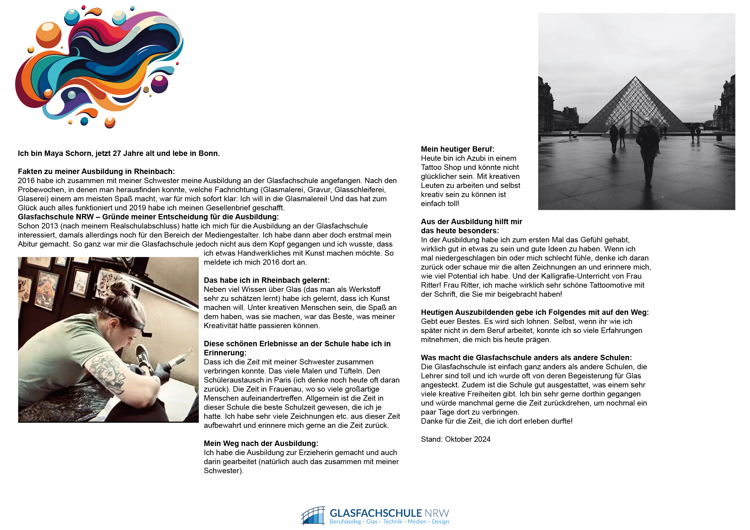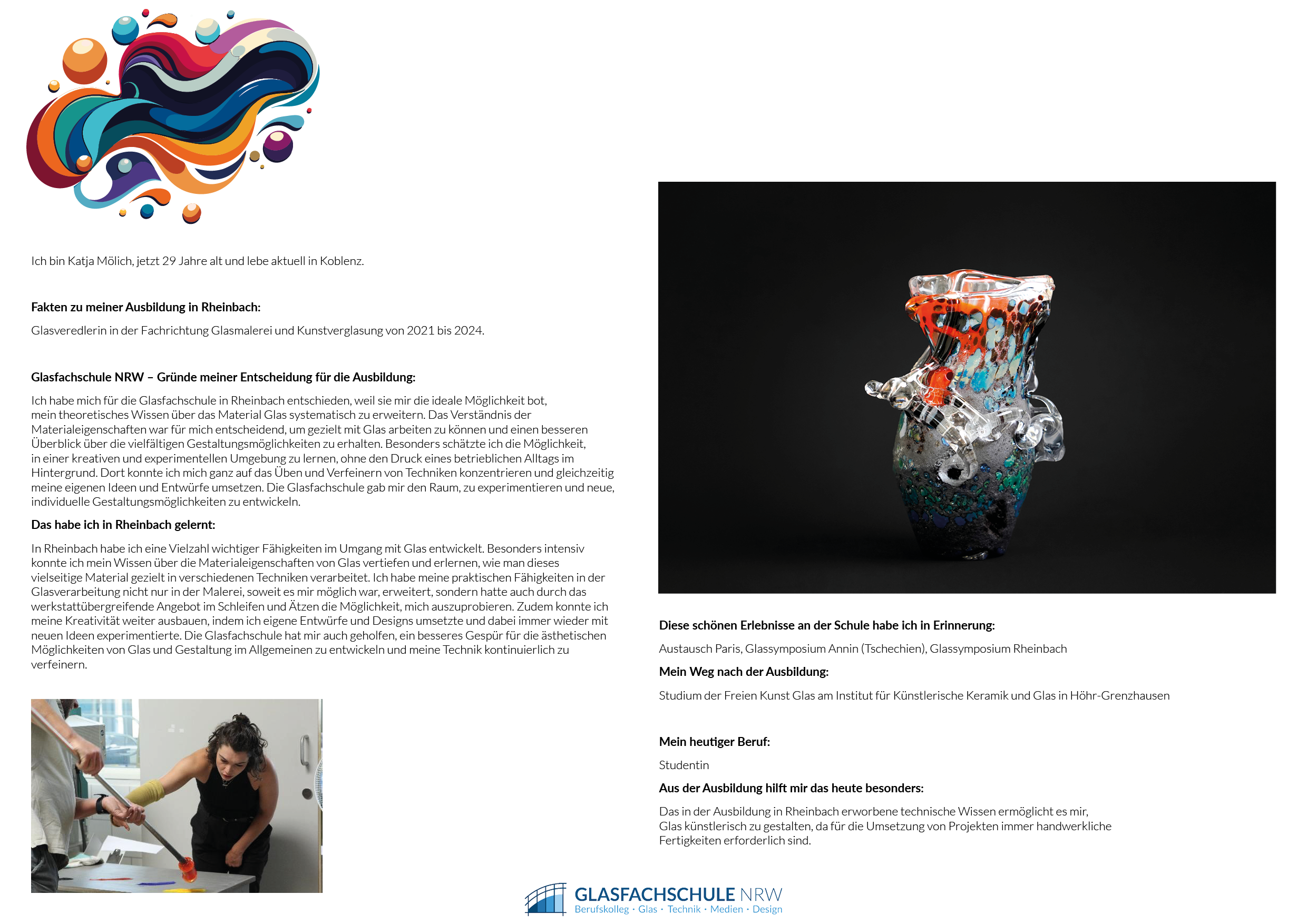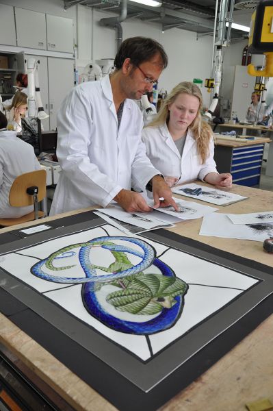 Ausbildung: Moderne Maltechniken, Bleiverglasung, Restaurierung, Drucktechniken, traditionelle Glasmalerei, moderne Schmelztechnologien