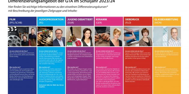 In diesem Jahr ist das vielfältige Differenzierungsangebot der GTA noch einmal erweitert worden, womit erstmalig zwölf verschiedene Kurse – neben Spanisch als zweiter Fremdsprache zur Erlangung der Allgemeinen Hochschulreife in der FOS 13 – zur Verfügung stehen.