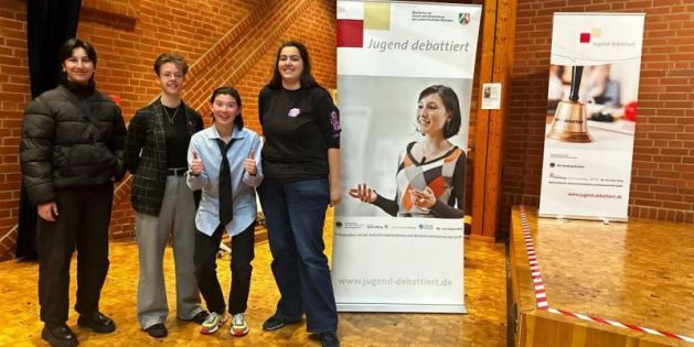 Durch den Schulwettbewerb am 15.12. hatten sich Vanessa Giffels (AG 22 z) und Sofia Amini (AM 21) für die Teilnahme qualifiziert. Als Nachrücker fungierten zunächst Denise Wiesen (AG 21 b) und Emma Mak (AM 21), wobei Erstere schließlich als Debattantin zum Einsatz kam. Den Part der Juroren/Zeitnehmer übernahmen Julia Meier und Tanja Durchholz.