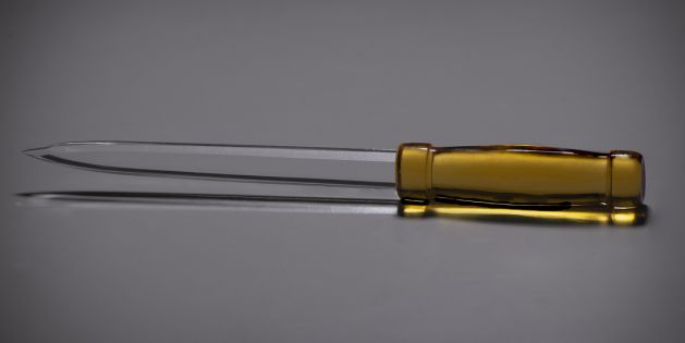 Dann überreichte er den Preis, einen eindrucksvollen Glasdolch von etwa 30 cm Länge, der in den Werkstätten der Glasfachschule von den Meistern Elena Ritter und Eduard Peters gefertigt wurde. Die Geehrte nahm ihn freudestrahlend entgegen, nicht ohne sich zu fragen, was man wohl am Flughafen zu diesem potenziellen Mordwerkzeug sagen werde…