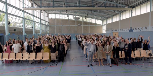 Die Feier fand bei bestem Sommerwetter und ausgelassener Stimmung in der festlich geschmückten Mensa der Schule statt. In seiner Ansprache würdigte Schulleiter Jochen Roebers die herausragenden Leistungen des Jahrgangs. Er hob nicht nur das Durchhaltevermögen und die Zielstrebigkeit der Schülerinnen und Schüler hervor, sondern auch ihre Kreativität und ihr Engagement während der vergangenen drei Jahre. Besonders gewürdigt wurden die Leistungen der besten Absolventin Ronja Michelfeit.