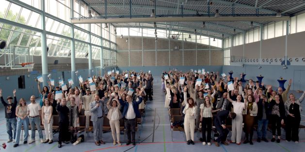 Mehr als hundert Schüler der Glasfachschule NRW in Rheinbach feierten gemeinsam mit Familie, Freunden und Lehrkräften ihre erfolgreichen Berufs- und Schulabschlüsse. Bereits am Freitag zuvor hielten die Abiturienten des Beruflichen Gymnasiums stolz ihre Zeugnisse der Allgemeinen Hochschulreife in den Händen. Die feierliche Abschlusszeremonie in der lichtdurchfluteten Sporthalle bot ein reichhaltiges Programm inklusive des musikalischen Überraschungsauftritts von Samantha Dettinger, die den im Fach „Audioproduktion“ produzierten Song „Gone“ vor den rund 300 Gästen souverän auf die Bühne brachte und manchen zu Tränen rührte. Schulleiter Jochen Roebers zollte den jungen Erwachsenen Respekt für die Bewältigung herausfordernder Zeiten. Er betonte in seiner Rede, dass unsere Gesellschaft die Ideen und die Energie der jungen Generation brauche, in der Berufswelt und in unserer Demokratie. Mit Blick auf das 75jährige Jubiläum des Grundgesetzes erinnerte Roebers daran, neben der Nutzung des öffentlichen Protests immer auch den zwischenmenschlichen Dialog zu suchen, auch wenn der demokratische Streit um die beste Lösung manchmal mühsam erscheine. Mit einer letzten „Hausaufgabe“ schloss er seine Rede ab: „Machen Sie die Zukunft zu Ihrer Zukunft!“ Besonders hervorgehoben wurden die Leistungen der besten Absolventen, darunter Maya Heyer (Berufliches Gymnasium), Jessica Dahmen, Anne Heyer, Lena Mengelberg, Denise Wiesen (alle Gestaltungstechnische Assistentinnen), Lena Schlösser (Berufsfachschule für Glastechnik und Glasgestaltung) und Tiago Neno (Fachoberschule für Gestaltung). Die Glasfachschule NRW ist Europaschule mit Beruflichem Gymnasium und bietet eine sinnstiftende Kombination aus theoretischer Ausbildung und praktischer Erfahrung inklusive vielfältigen Möglichkeiten von integrierten Auslandsaufenthalten. Mit einem breiten Spektrum an Bildungsgängen bereitet sie die Schüler optimal auf die Herausforderungen der modernen Arbeitswelt vor. Mit dem Abschluss dieses Kapitels beginnen nun sechs Wochen Ferien. Doch was kommt danach? Jeder Absolvent, der seine Zeugnisse entgegennahm, hat individuelle Pläne für die Zukunft. Sei es ein weiterführender Bildungsgang an der Glasfachschule, ein Studium oder der Einstieg ins Berufsleben. Wir gratulieren allen Schülern, die in diesem Jahr ihre Abschlussprüfungen an der Glasfachschule NRW bestanden haben, zu ihrem Abschluss und wünschen ihnen viel Erfolg auf ihrem weiteren beruflichen Weg!