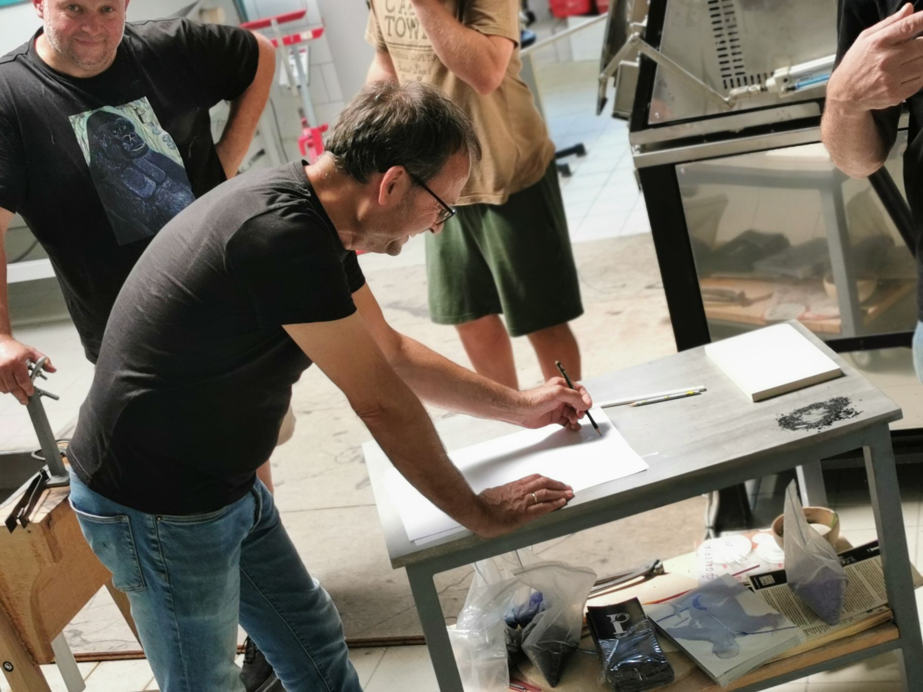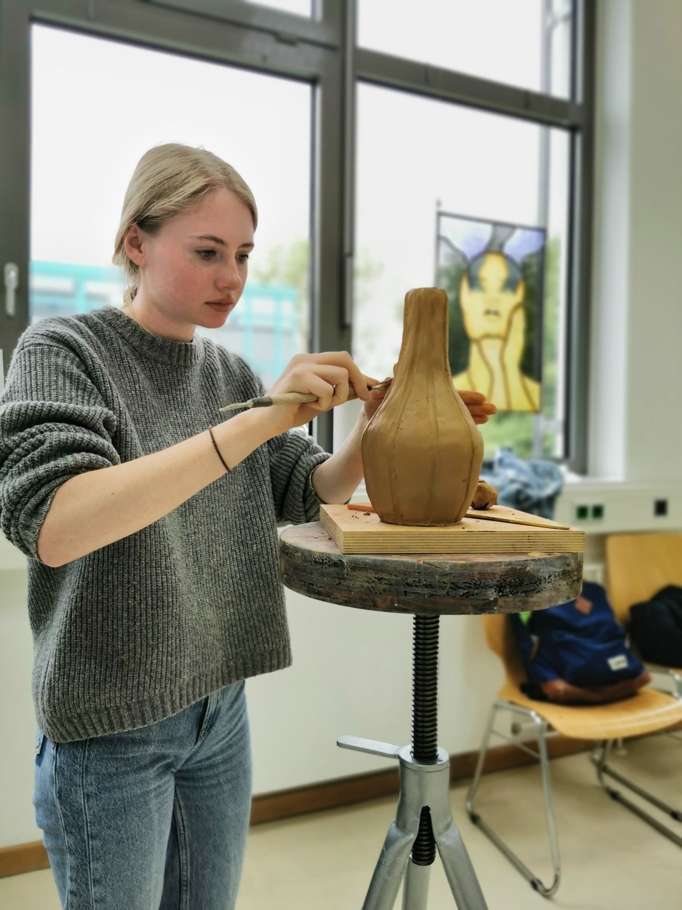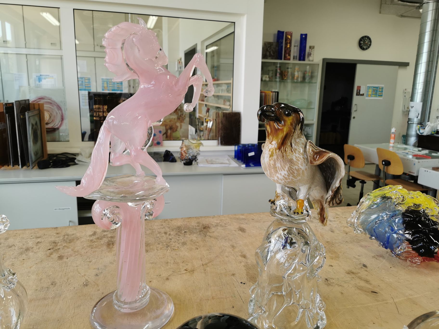 Vom 12. bis 14. Juni war als ein Höhepunkt der Glaskünstler Jiří Pačinek aus dem Glass-Valley in Tschechien zu Gast, um die Transformation traditioneller Glaskunst in die heutige Zeit zu vermitteln. Dafür haben die Schüler zu Beginn des Workshops zusammen mit dem Künstler Wilhelm Vernim eigene Glasobjekte auf Papier entworfen und in Ton und Wachs modelliert. Diese vielfältigen Entwürfe hat Jiří Pačinek dann am Studioofen gemeinsam mit den Schülern umgesetzt. Die besonderen Werke des Künstlers sind auch bekannt aus dem Hollywoodfilm „Glass Onion“ mit Daniel Craig, für den er die gesamte Glaskunst geschaffen hat. Die Glaskünstler Markus Marschmann und Marc Locock haben darüber hinaus am Studioofen gearbeitet, um den Schülern Techniken zur Herstellung von Glasobjekten aus Heißglas zu vermitteln.