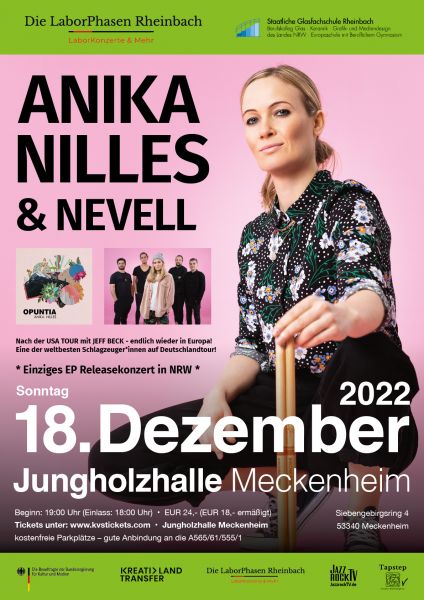 Anika Nilles, für ihre rhythmische Intelligenz seit Jahren in der Fachwelt bewundert, veröffentlichte Anfang des Jahres ihr drittes Album „Opuntia“. Ein Kaktus! Als Titel für ein Album ist das eine ungewöhnliche Wahl, wenn auch nicht verwunderlich. „Die Musik ist über die Monate der Pandemie hinweg entstanden und spiegelt auch ein wenig die Stimmungslagen wieder, die ich als Musikerin durchlebt habe“. Es ist als Feststellung gedacht, nicht als Klage. Und damit passt die Idee perfekt zu der Musik. Anikas Sound ist ein Schmelztiegel von Einflüssen aus Jazz, Funk, Rock, Pop und allem dazwischen. Ihre lebendige Persönlichkeit strahlt von der Bühne, was jedem Konzert eine Einzigartigkeit verleiht. Dies weiß auch der legendäre Gitarrist und mehrfache Grammy Gewinner „Jeff Beck“ zu schätzen und holte sie 2022 in seine aktuelle Touring Band. Das weltweit einflussreichste Schlagzeugmagazin „Modern Drummer“ (USA) hob sie aufs Titelblatt. Sie war die fünfte Frau in knapp vier Jahrzehnten. Nilles beweist auch, dass es nie zu spät ist mit der Musik anzufangen, denn sie hat die Sticks erst mit 26 Jahren professionell in die Hand genommen und es seitdem niemals bereut. Ganz im Gegenteil!