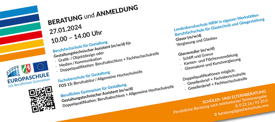 Nutzen Sie unseren Beratungs- und Anmeldetag am 27.01.2024 von 10:00 -14:00, um sich in der Schule rund um unsere Ausbildungsangebote zu informieren. Seien es Zugangsvoraussetzungen, Aufnahmetest, Ausbildungsinhalte oder Anschlussmöglichkeiten. Die Lehrerinnen und Lehrer stehen für Gespräche zur Verfügung und geben Ihnen alle gewünschten Informationen.