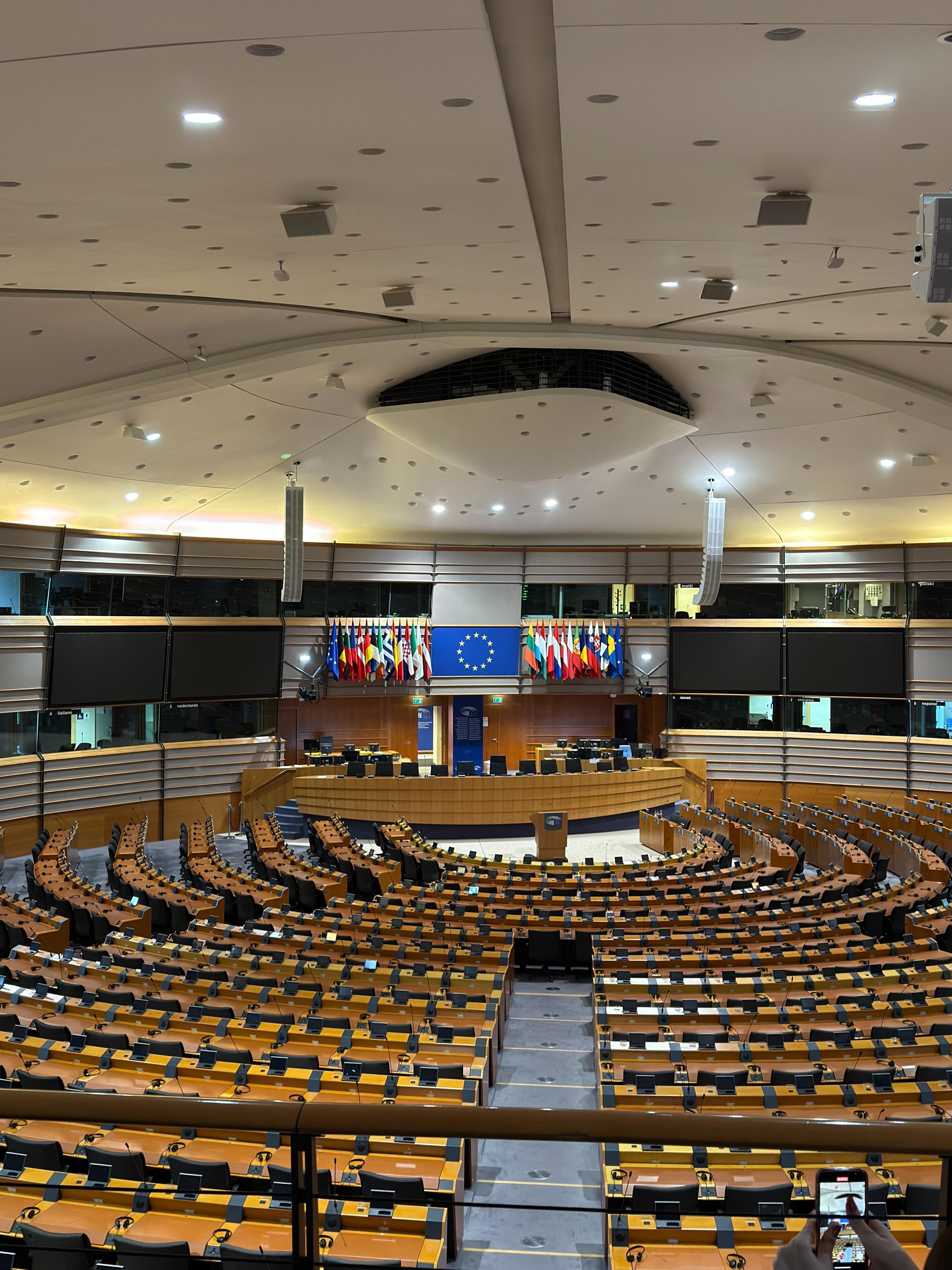 Das Europäische Parlament ist ein beeindruckendes Gebäude, sowohl architektonisch als auch symbolisch. Nach Personalausweis- und Sicherheitscheck um halb elf, begann der Besuch mit einer kurzen Einführung in die Geschichte der Europäischen Union und die Funktionsweise des Parlaments. Wir erfuhren, wie das Parlament als Organ der EU direkt gewählte Abgeordnete aus den Mitgliedsländern zusammenbringt, um Gesetze zu erlassen, die für Millionen von Bürgern in ganz Europa gelten. Besonders beeindruckend war der plenare Sitzungssaal, der von moderner Architektur und technologischer Ausstattung geprägt ist. Der riesige Saal wirkte fast wie ein Theater, mit einer Mischung aus großen Kuppeln und hochmodernen Medienständen. Hier werden bedeutende politische Debatten geführt und Gesetze verabschiedet, die weit über die Grenzen Belgiens hinaus Wirkung entfalten. Das Highlight des Besuchs war das Gespräch mit Vize-Präsidentin Sabine Verheyen, die es den Schüler*innen ermöglichte ein besseres Verständnis zu erlangen, wie sich Politik auf die gesamte EU auswirkt. Zwischen elf und zwölf Uhr erzählte uns die CDU-Politikerin von ihren Arbeitsbereichen im Parlament und beantwortet ebenfalls Fragen, die die Schüler*innen im Vorfeld vorbereitet haben. Frau Verheyen, „Eine Schwarze mit roten Streifen und grünen Punkten“, wie sie sich selbst bezeichnete, um ihren Stand und ihre Sichtweise zwischen den Parteien zu visualisieren, berichtete über das Einwirken in der Digitalisierung, über Integration der Jugend und über kleinere Themen, wie und warum sie sich zum Bespiel für die CDU entschieden hat. Kurz nach dem Gespräch ermöglichte Frau Verheyen uns ein Gruppenfoto mit ihr, um den Besuch einen krönenden Abschluss zu verleihen.