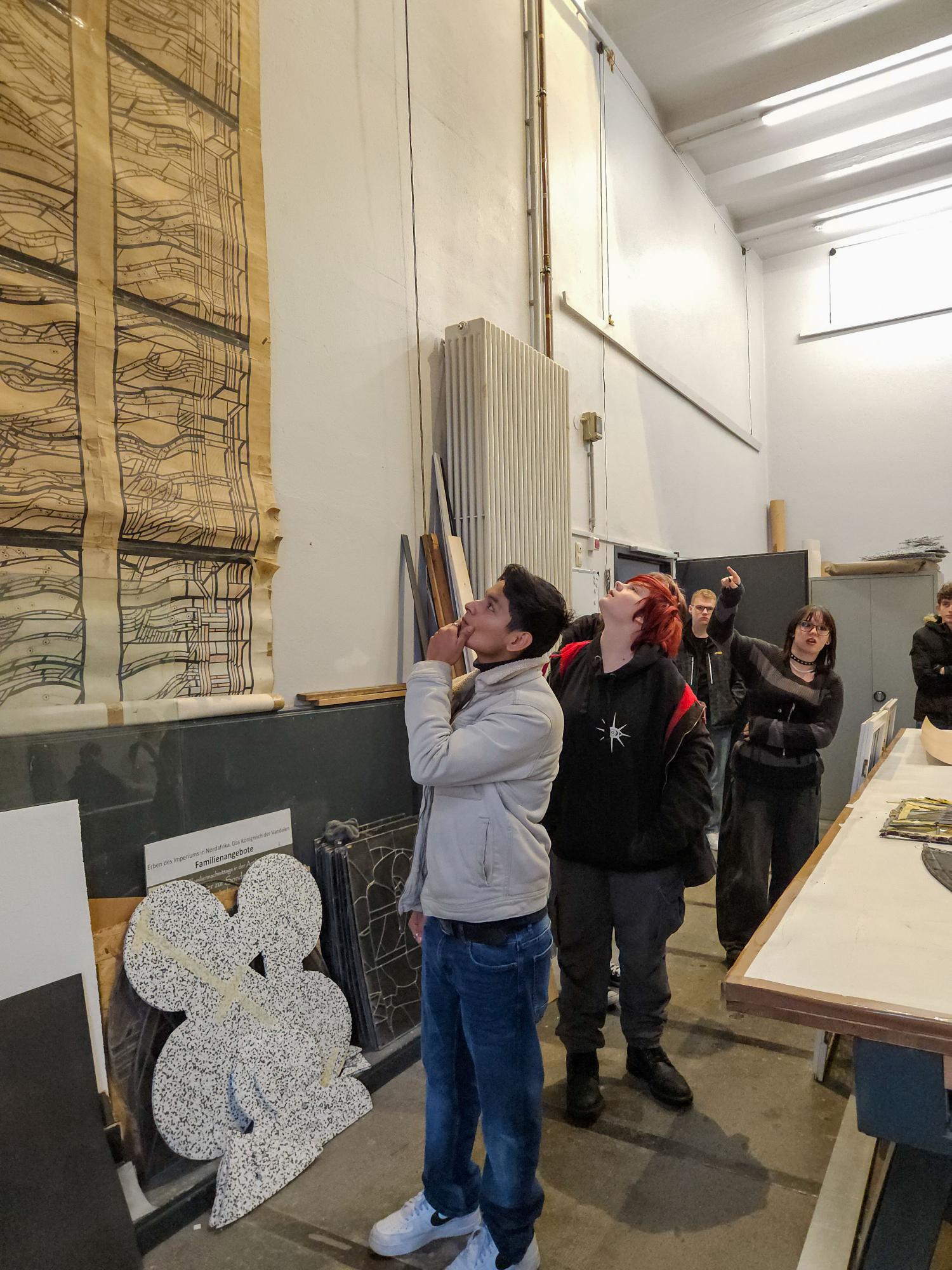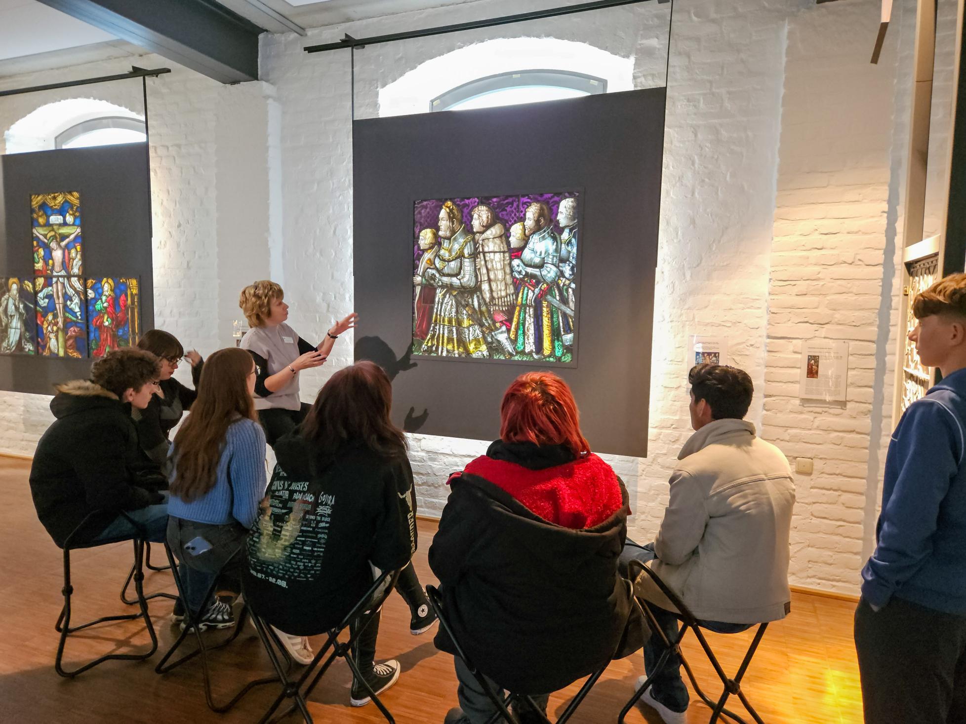 Das ebenfalls in Linnich beheimatete Glasmalereimuseum wartete mit einem Ritt durch die Geschichte der Glasmalereikunst auf die Auszubildenden. Schnell zeigten sich die unterschiedlichen künstlerischen Vorlieben der Auszubildenden: Konnten sich die einen kaum von sehr realistisch gemalten Glasfenstern nach mittelalterlichen Vorlagen trennen, waren andere von abstrakter skulpturaler Glaskunst begeistert. Alle aber hatten immer wieder die Frage im Kopf: „Wie macht man das?“ – eine gute Inspiration für die eigene Arbeit.