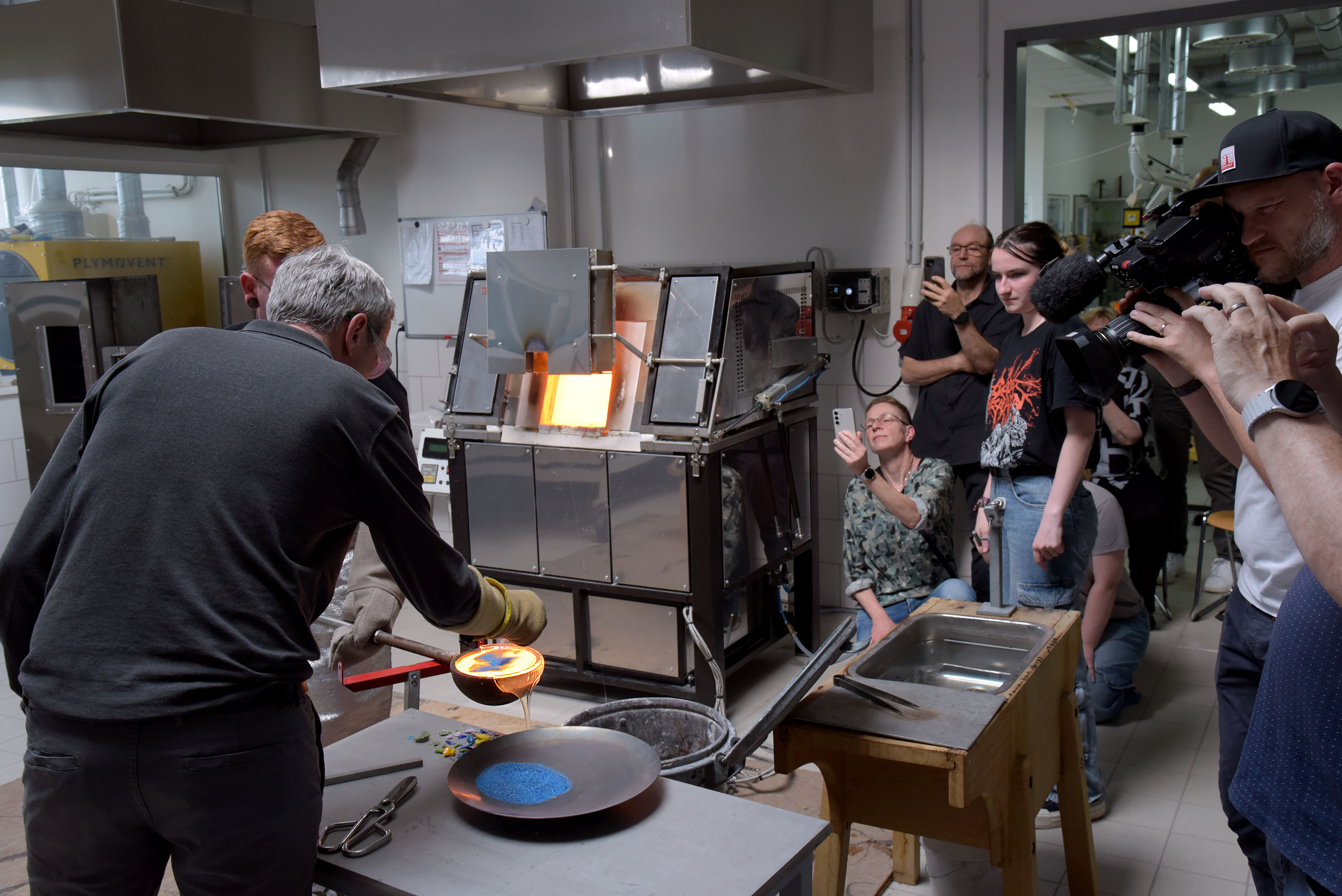 Gemeinsam mit den Auszubildenden zum Glaser und Glasveredler spannten sie den Bogen vom römischen Glasblasen mit alten Rezepturen bis hin zum Herstellen von Glasobjekten am modernen Studio-Ofen in den Werkstätten der Schule.