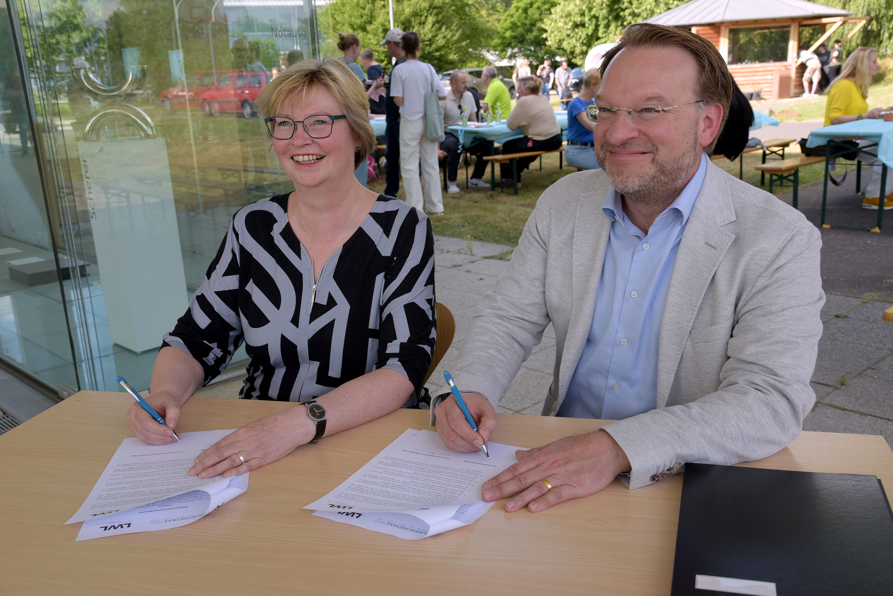 Beim „Glasfest" am Donnerstag, 10.07.2025, wurde die Kooperation durch Frau Dr. Kirsten Baumann, Direktorin des LWL-Museums für Industriekultur, und Herrn Jochen Roebers, Schulleiter der Glasfachschule NRW, feierlich besiegelt.