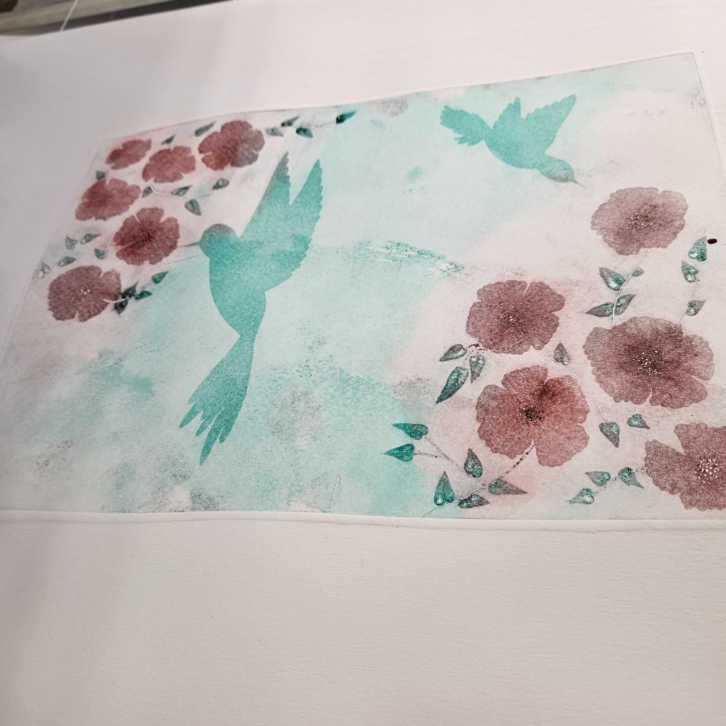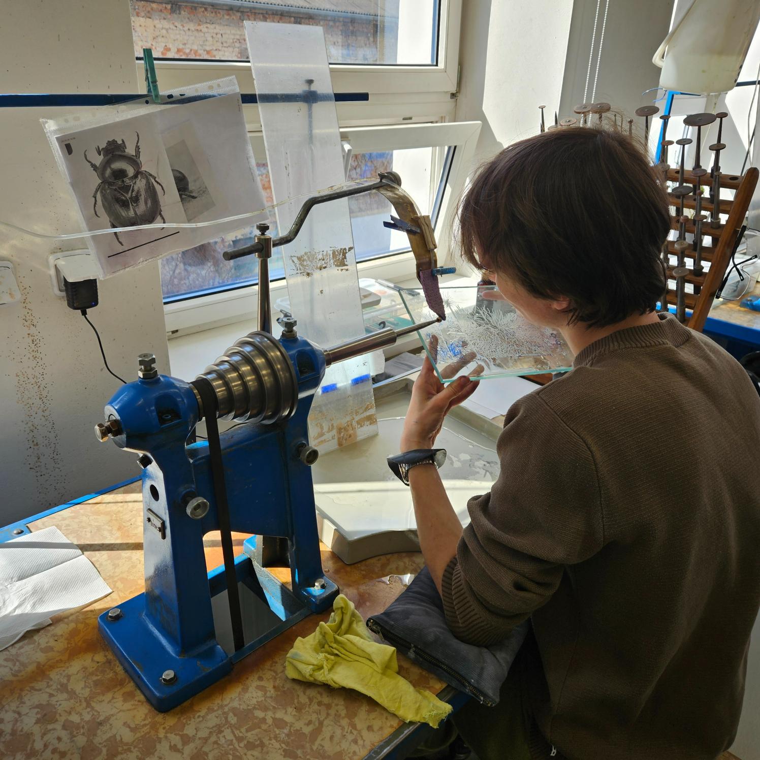 Vitreografie als zweite Technik ist ein Tiefdruckverfahren, welches uns von der Lehrerin Vladimíra Jelínková beigebracht wurde. Ein ähnliches, bekannteres Verfahren ist der Kupferstich. Auch hier standen persönliche Entwürfe auf Papier am Anfang. Diese wurden mit verschiedenen Techniken wie Sandstrahlung und Gravur auf Floatglasscheiben übertragen. Zum finalen Druck trugen wird Druckfarben auf die Scheibe auf und zogen die Oberfläche anschließend mit einer Rakel ab. Die Farbe haftete nun nicht an den glatten, sondern nur an mattierten und gravierten Flächen. Wir platzierten die Scheibe in eine Druckpresse und legten ein Blatt angefeuchtetes Papier darauf. Durch die Druckpresse wurde das Motiv auf das Papier übertragen. Durch kreatives Nutzen dieser Technik bei Scheibenfertigung und im Druck selbst konnten wir dabei ganz individuelle, tolle Designs erstellen!