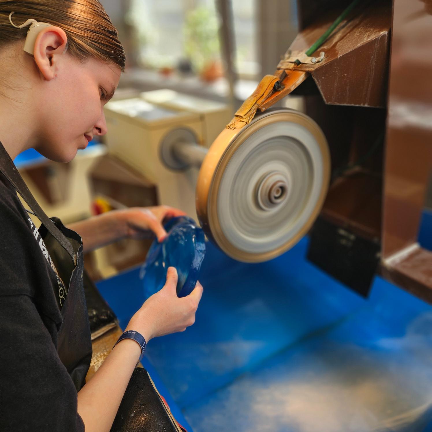 Im Fokus stand die Arbeit in den Werkstätten der Partnerschule: Wir durften in der Glasschule in Kamenický Šenov zwei neue Techniken kennenlernen: Das Formschmelzen und die Vitreografie als Druckverfahren. Das Formschmelzen wurde uns von Petr Stacho, dem bekannten tschechischen Glaskünstler, beigebracht. Wir haben mit Zeichnungen zuerst einen Eigenentwurf für ein Relief entwickelt, das wir anschließend in Ton realisiert haben. Diese Ton-Form haben wir daraufhin in Gips-Schamott abgegossen, um eine feuerfeste Negativform herzustellen. Nachdem diese vollständig ausgehärtet war, konnten wir den Ton herauslösen und durch das mit Wasser abgemessene Volumen die benötigte Glasmenge hereinlegen und das Ganze über das Wochenende im Glasofen einschmelzen. Danach lösten wir den Gips von der erschmolzenen Glasform, entfernten noch scharfe Grate am Schleifrad – und fertig waren unsere Reliefgläser! Zurück in Rheinbach werden unsere Stücke im wahrsten Sinne noch den letzten Schliff erhalten, um matte Stellen zu haben, aber auch um zu glänzen.