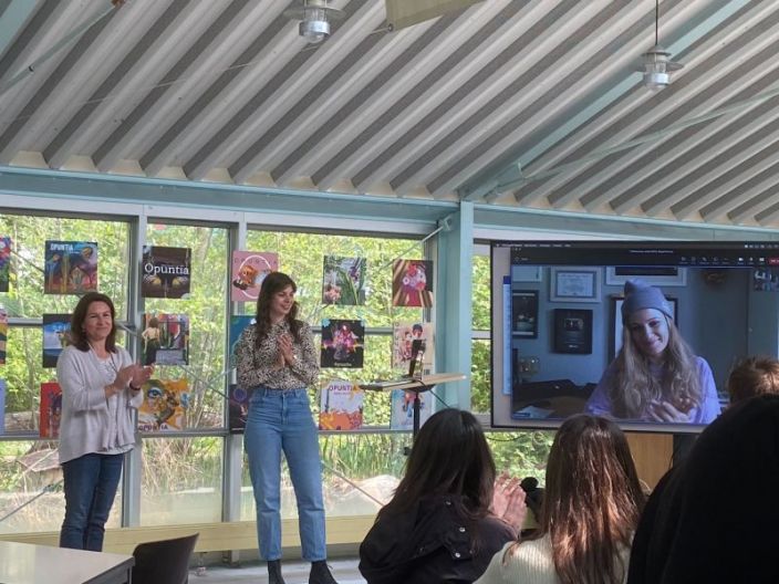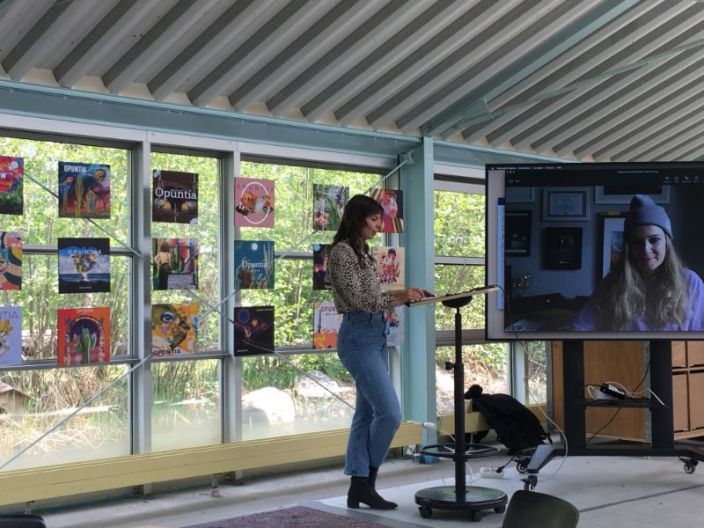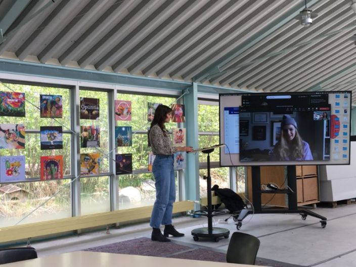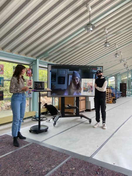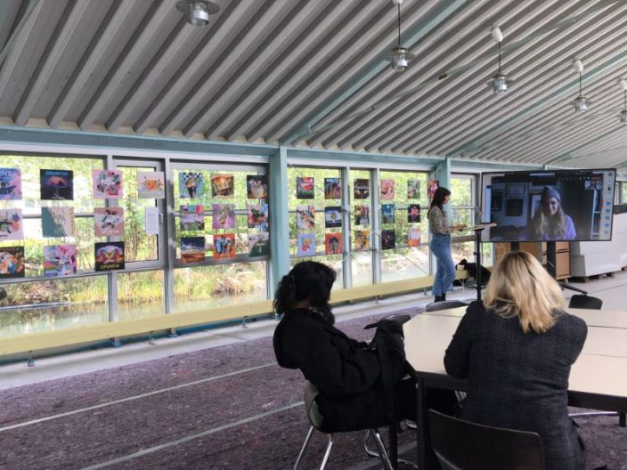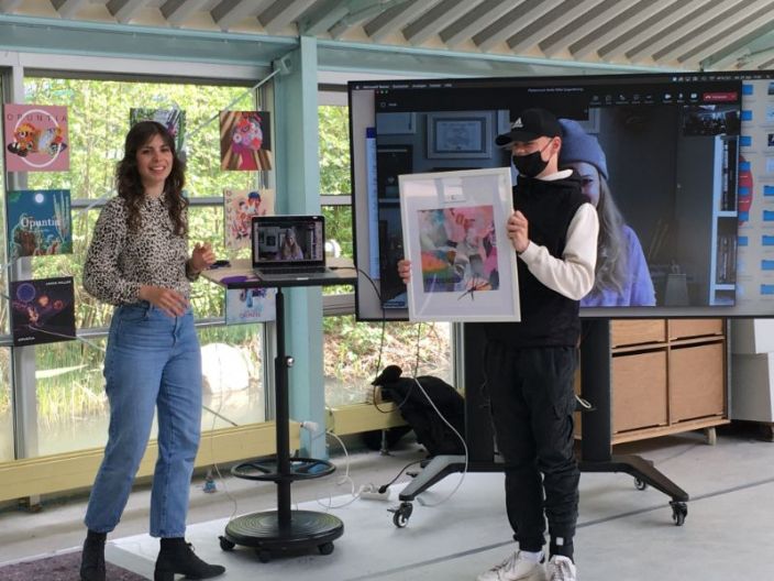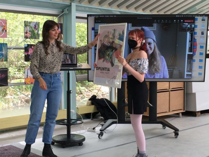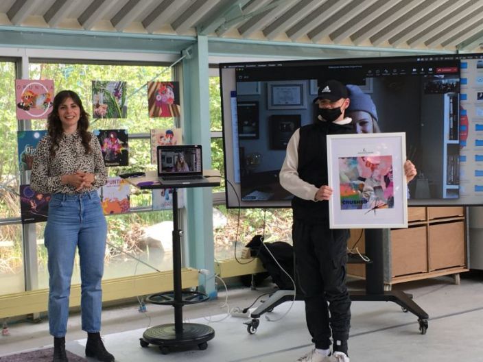 Am 27.04.2022 fand die Siegerehrung mit den beiden Klassen der Gestaltungstechnischen Assistent*innen in der Mensa vor den ausgestellten Plattencovern statt. Anika Nilles wurde über Teams hinzugeschaltet und war über einen großen Monitor zu sehen. Anika bedankte sich noch mal ganz herzlich für die vielen großartigen Ergebnisse. Sie ist nach wie vor von den Entwürfen begeistert. Sie erzählte, dass der Entscheidungsprozess alle Bandmitglieder eingespannt hat und zu langen Diskussionen geführt habe. Letztendlich hat sich Anika Nilles durchgesetzt und sich für drei Entwürfe entschieden.