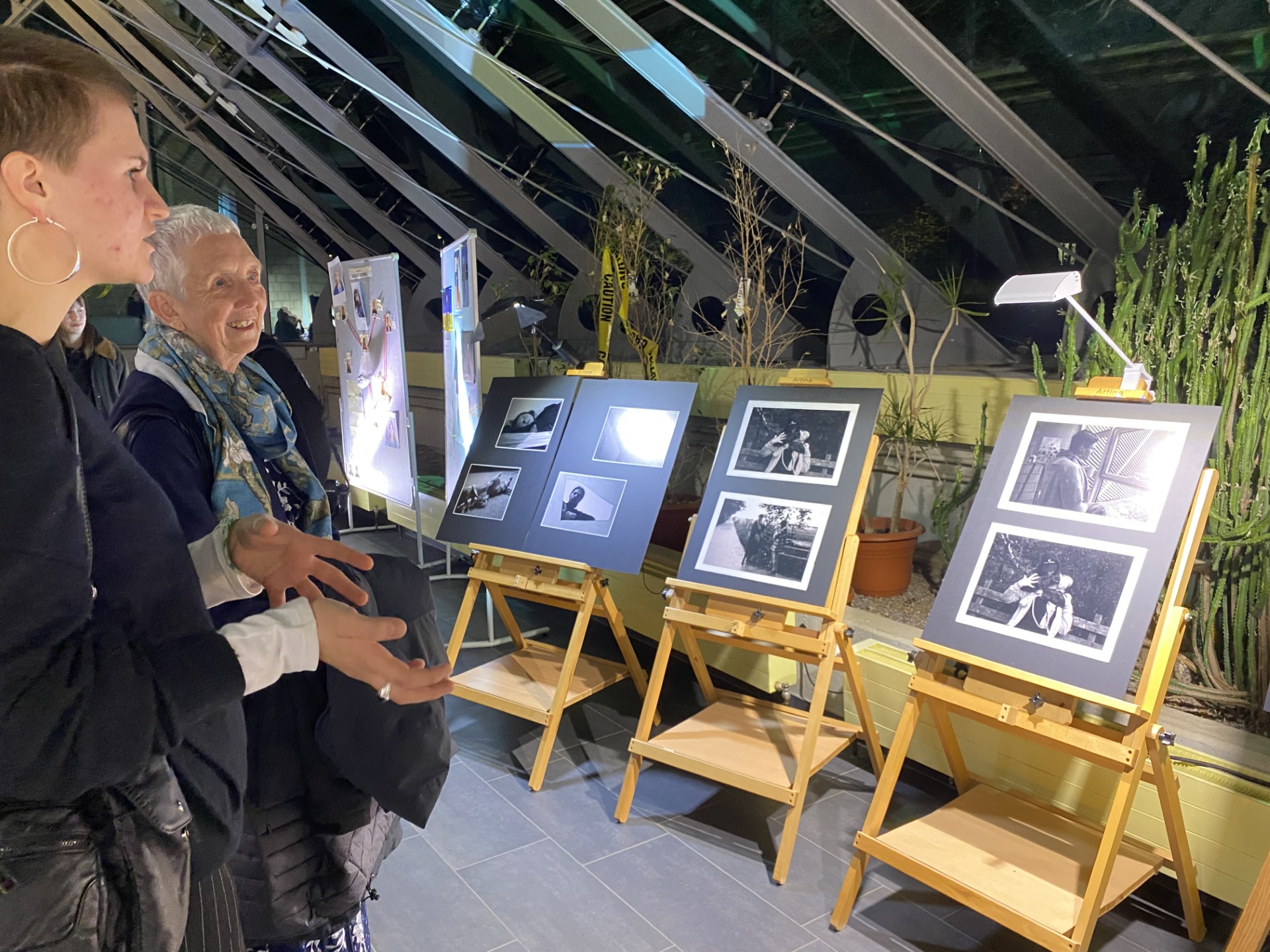 Gezeigt wurden beispielsweise Piktogramme, die markante Merkmale der Figuren in vereinfachender grafischer Darstellung wiedergeben. Auch animierte Charaktere und Fotografien zu Schlüsselszenen, die in Verbindung mit einer perfekt inszenierten Beleuchtung für die entsprechende Atmosphäre sorgten, waren Gegenstand der Ausstellung, die begeistert von der Autorin selbst sowie vom Publikum in Augenschein genommen wurde. Die Schülerinnen und Schüler der Glasfachschule hatten die Ausstellung einem Tatort entsprechend mit Leichenfundort und Absperrband sowie Aufklebern, die blutige Hand- und Fußabdrücke zeigten, hergerichtet und standen der Autorin und den Besuchern auf Englisch und Deutsch Rede und Antwort. Die SV versorgte die Gäste derweil gegen eine kleine Spende für die Abschluss-Kasse mit Getränken und Snacks.
