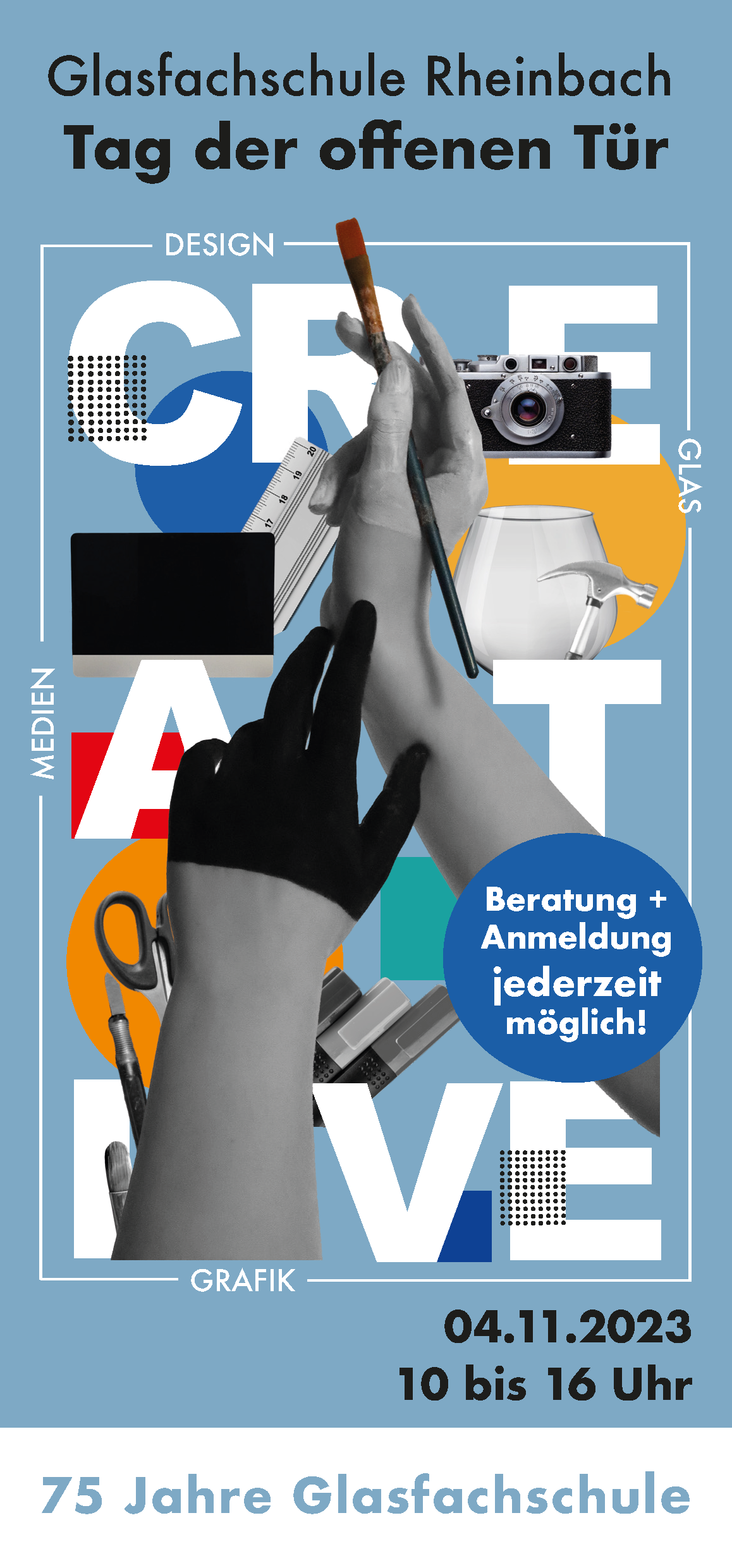 Erleben Sie im 75. Jahr unseres Bestehens unsere Schülerinnen und Schüler im Unterricht bei der Entwicklung und Umsetzung heutiger Gestaltungsideen mit modernster Software, im Fotostudio und bei der Filmproduktion. In den Werkstätten können Sie uns bei der faszinierenden Arbeit mit dem Werkstoff Glas beobachten und sich erläutern lassen, warum auch CAD und 3D-Druck heute eine große Rolle bei uns spielen. Zudem können Sie einige Glas-Werkstücke gegen eine kleine Spende erwerben. Unsere Schülerinnen und Schüler sowie Lehrkräfte stehen für alle Ihre Fragen gerne zur Verfügung.